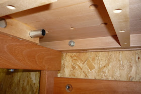 Weiter habe ich die Hobelbank durch, an das Fußgestell geschraubt und geleimte Klötze aus Buche um 80mm höhergesetzt. So hat sie eine für mich optimale Höhe von ca. 960mm